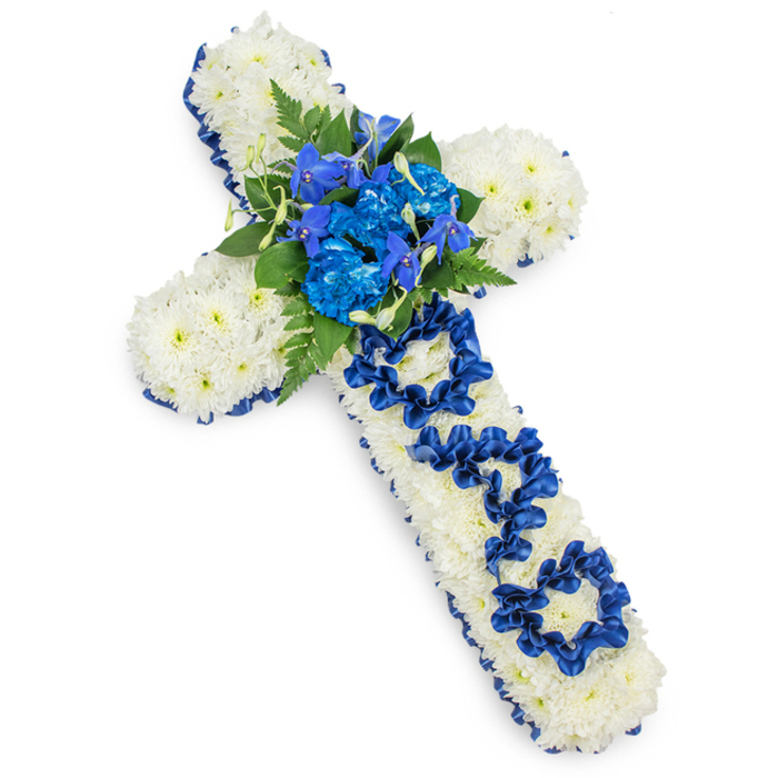 Both deeply personal and touching, this lovely tribute is created of fresh and beautiful white chrysanthemums which are delicately accented with carnations and delphinium in blue hues. An emotional gift to declare yourr true admiration and love to one of the most important people in your life.