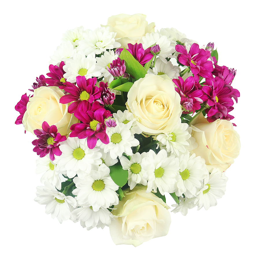 Featuring an exquisite mix of peach roses, captivating purple sprayed chrysanthemums, soft matricaria, and graceful ruscus, every flower is hand-selected to harmonize perfectly into a display of natural artistry. Watch as the bouquet blossoms from compact buds into a vibrant celebration of color and form.